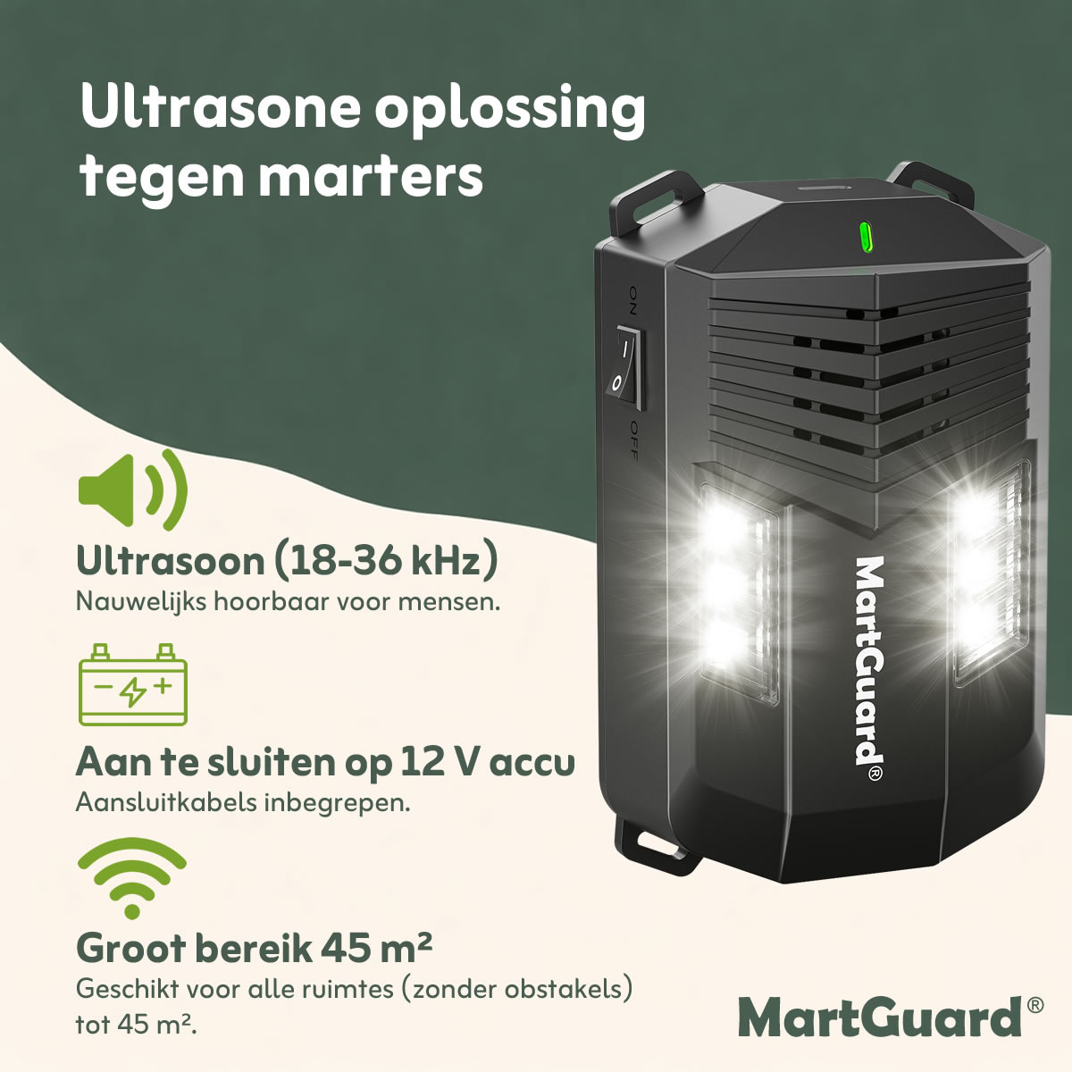 Heeft u last van marters onder de motorkap, in de garage of zelfs binnenshuis? De MartGuard® Car & Home Secure Pro 3-in-1 Premium is een krachtige en veelzijdige marterverjager die speciaal is ontwikkeld voor langdurige bescherming op meerdere locaties. Dankzij variabel ultrasoon geluid, fel flitslicht en een slimme vibratiesensor jaagt dit apparaat marters effectief weg, zonder ze te schaden. Daarnaast bevat deze mobiele marterverjager een extra stevige ABS behuizing.